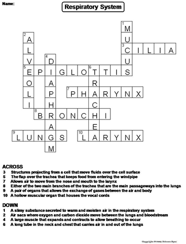 Respiratory System Crossword Answers. Words used are as follows. This RESPIRATORY SYSTEM crossword puzzle with answer key is a great option for middle school or high school health or science classes. The puzzle includes 21 words related to the respiratory system including basic anatomy functions and problems associated with the respiratory systemThis would be g. This product comes with student sheet student sheet with word bank and answer. Red swollen or painful. One way air gets in and out of the body.