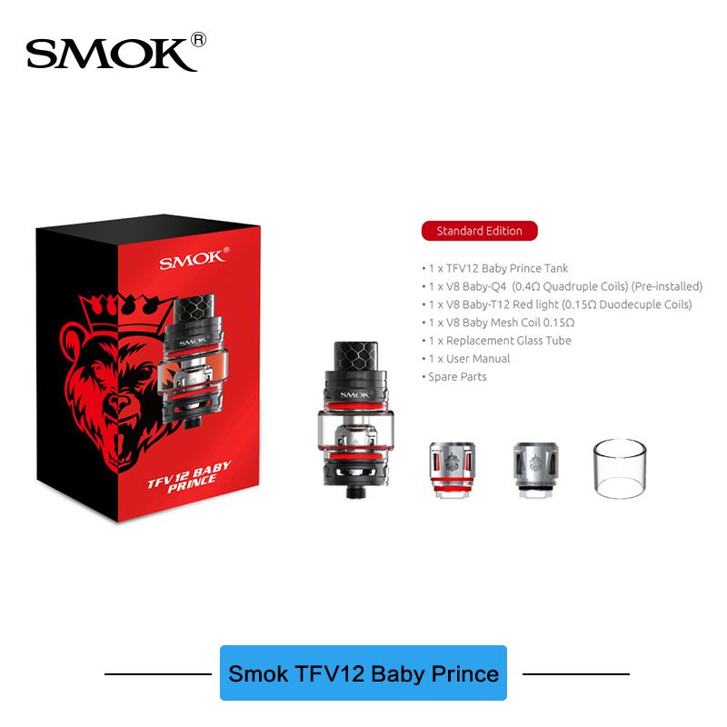 The Baby Prince is truly a union an amalgamation of all the seemingly best characteristics of the entire line of TFV8 and TFV12 sub-ohm tanks of the past 18 months or so and is supposed to be the crowning achievement of all these various tanks. Ubervape is an official UK distributor of. Its included V8 baby -Q4 V8 baby-T12 red light coil and V8 Baby Mesh coil are compatible with baby beast coils the new coils can produce denser clouds and purer flavor at the same wattage which. The SMOK TFV12 Baby Prince Sub-Ohm Tank is the culmination of design elements from the industry-change TFV8 Baby Beast Tank and the current leading tank in its segment the TFV12 Prince Tank. Smok TFV12 Prince Cobra Edition Tank List Price. The Smok TFV12 Baby Prince Tank features a fast-heating mesh coil coils with lights inside them denser vapor output a 45ml juice capacity a top fill system with patented lock and massive external airflow that is enhanced by Cobra drip tips. And the kit includes three newest carefully modulated coils. SMOK Replacement GlassSMOK Replacement Coils SMOK TFV12 Baby Prince Sub-Ohm Tank Features. A superb choice for both clouds and flavourWorks with Smok TFV12 Baby Prince coils.
